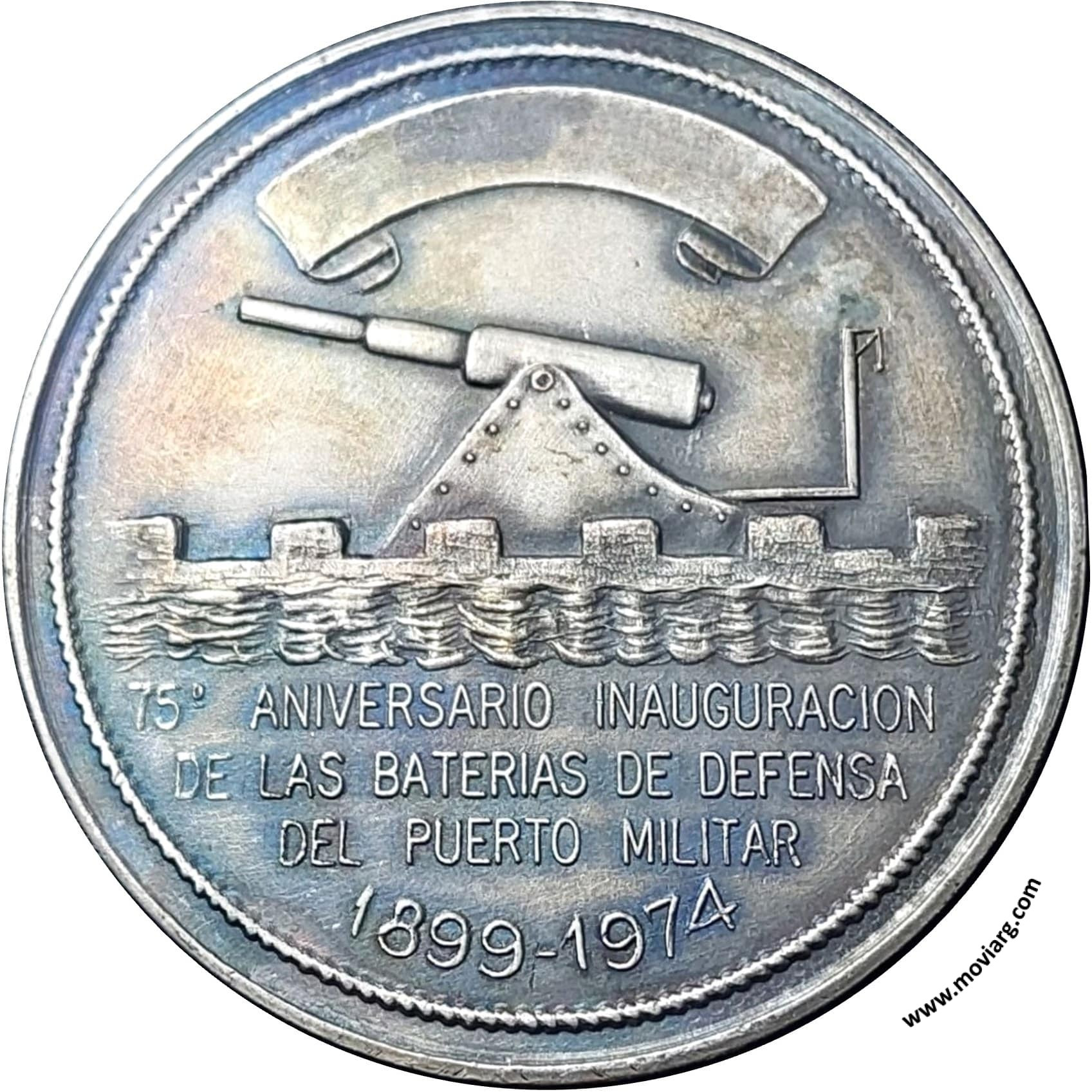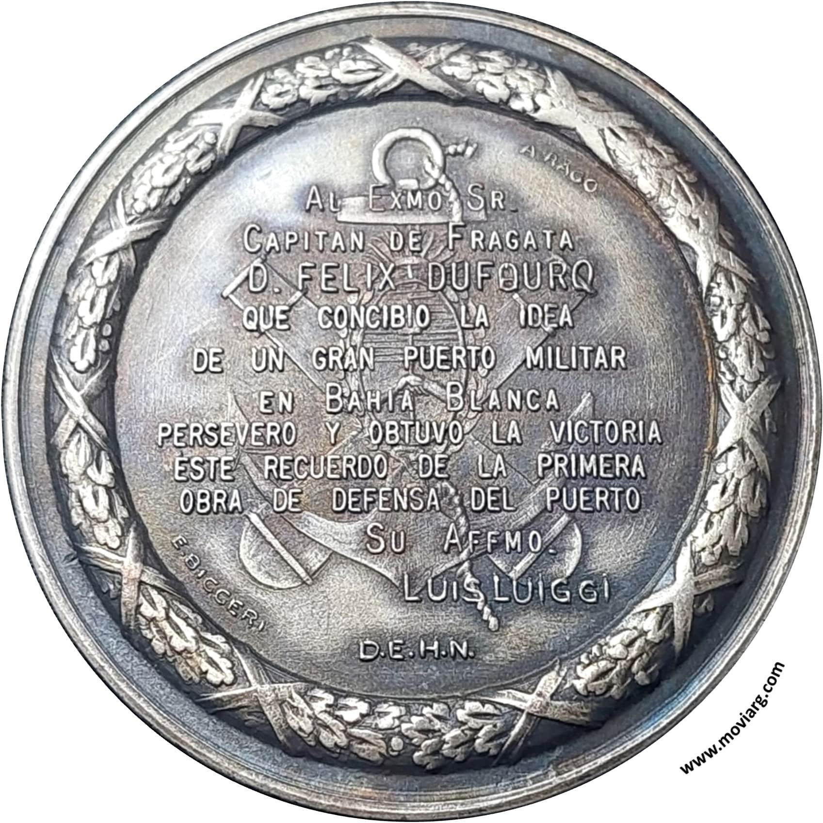Anverso: 75° ANIVERSARIO INAUGURACION / DE LAS BATERIAS DE DEFENSA / DEL PUERTO MILITAR / 1899 - 1974 Reverso: AL EXMO. SR. / CAPITAN DE FRAGATA / D. FELIX DUFOURQ / QUE CONCIBIO LA IDEA / DE UN GRAN PUERTO MILITAR / EN BAHIA BLANCA / PERSEVERO Y OBTUVO LA VICTORIA / ESTE RECUERDO DE LA PRIMERA / OBRA DE DEFENSA DEL PUERTO / SU AFFMO. / LUIS LUIGGI / D.E.H.N. Firma: E. BICCERI / A. RACO Referencia: | |