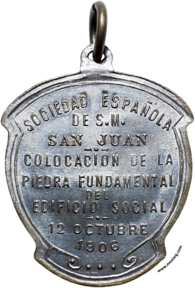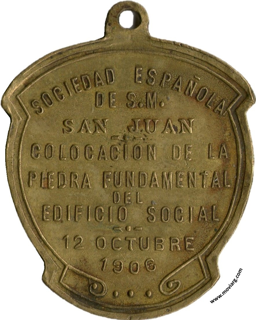 Anverso: Reverso: SOCIEDAD ESPAÑOLA / DE S.M. / SAN JUAN / COLOCACION DE LA / PIEDRA FUNDAMENTAL / DEL / EDIFICIO SOCIAL / 12 OCTUBRE / 1906 Referencia: | |