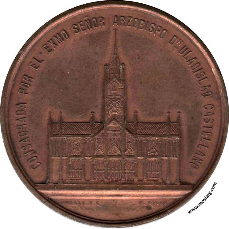 Anverso: CONSAGRADA POR EL EXMO. SEÑOR ARZOBISPO DR. ULADISLAO CASTELLANO. Firma: ORZALI B. Y C. Reverso: INAUGURACION / DE LAS / OBRAS DE ENSANCHES / Y CONSAGRACION DE LA / IGLESIA PARROQUIAL / DE SAN PONCIANO / LA PLATA / 9 DE NOVIEMBRE 1896 / PADRINOS / EXMO. GOBERNADOR DE LA PROVINCIA DR. GUILLERMO UDAONDO Y SRA. JOSEFINA L. DE UDAONDO Referencia: | |