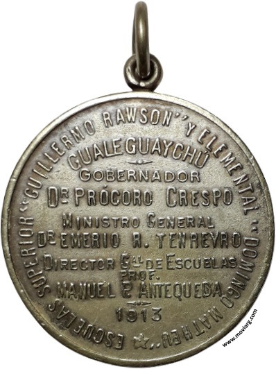 Anverso: CONSEJO GENERAL DE EDUCACION / PROV. DE ENTRE-RIOS Reverso: ESCUELAS SUPERIOR "GUILLERMO RAWSON" Y ELEMENTAL "DOMINGO MATHEU" / GUALEGUAYCHÚ / GOBERNADOR / DR. PRÓCORO CRESPO / MINISTRO GENERAL / DR. EMERIO R. TENREYRO / DIRECTOR GAL. DE ESCUELAS / PROF. / MANUEL P. ANTEQUEDA / 1913 Referencia: | |