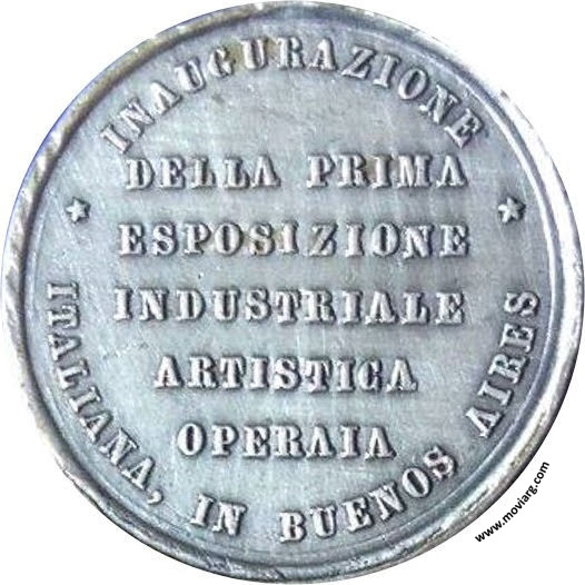 Anverso: SOCIETÁ UNIONE OPERAI ITALIANI / 20 MARZO 1881 Reverso: INAUGURAZIONE / DELLA PRIMA / ESPOSIZIONE / INDUSTRIALE / ARTISTICA / OPERAIA / ITALIANA, IN BUENOS AIRES Canto: Humberto Burzio: "Buenos Aires en la medalla" 1981 p440. Referencia: BURZIO-1269 | |