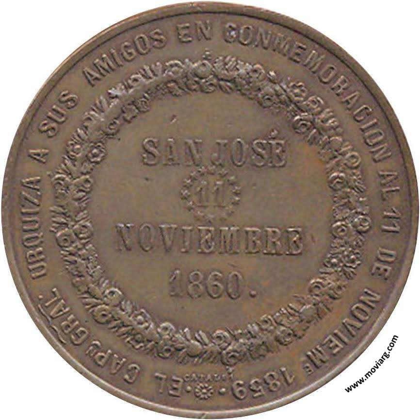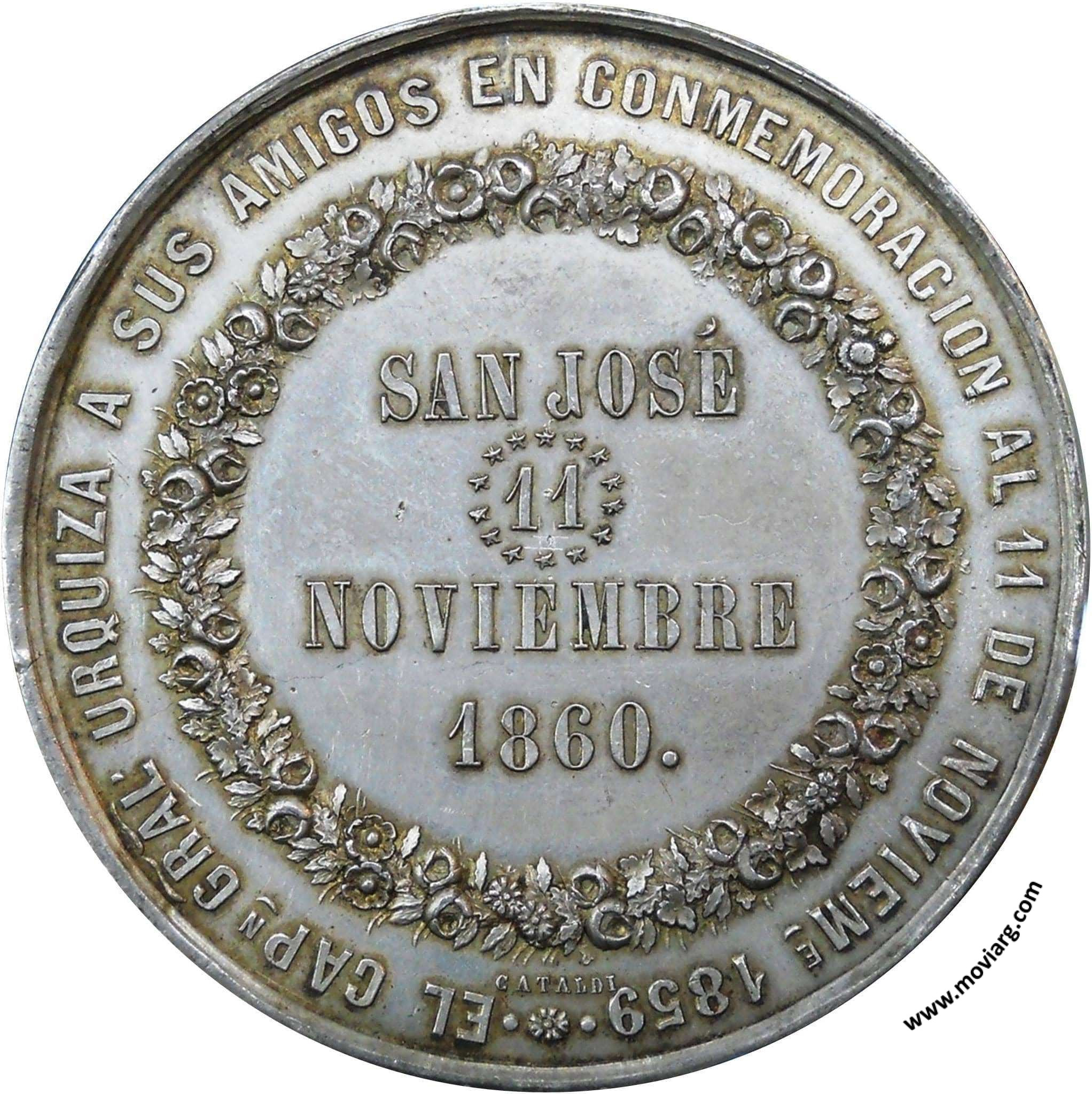 Anverso: Reverso: EL CAPN. GRAL. URQUIZA A SUS AMIGOS EN CONMEMORACION AL 11 DE NOVIE. 1859. SAN JOSE / 11 / NOVIEMBRE / 1860. Firma: Cataldi Referencia: | |