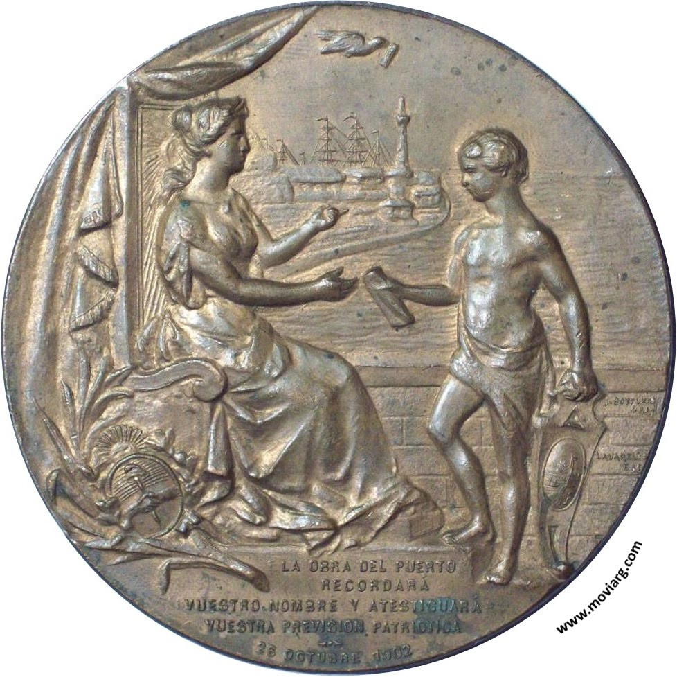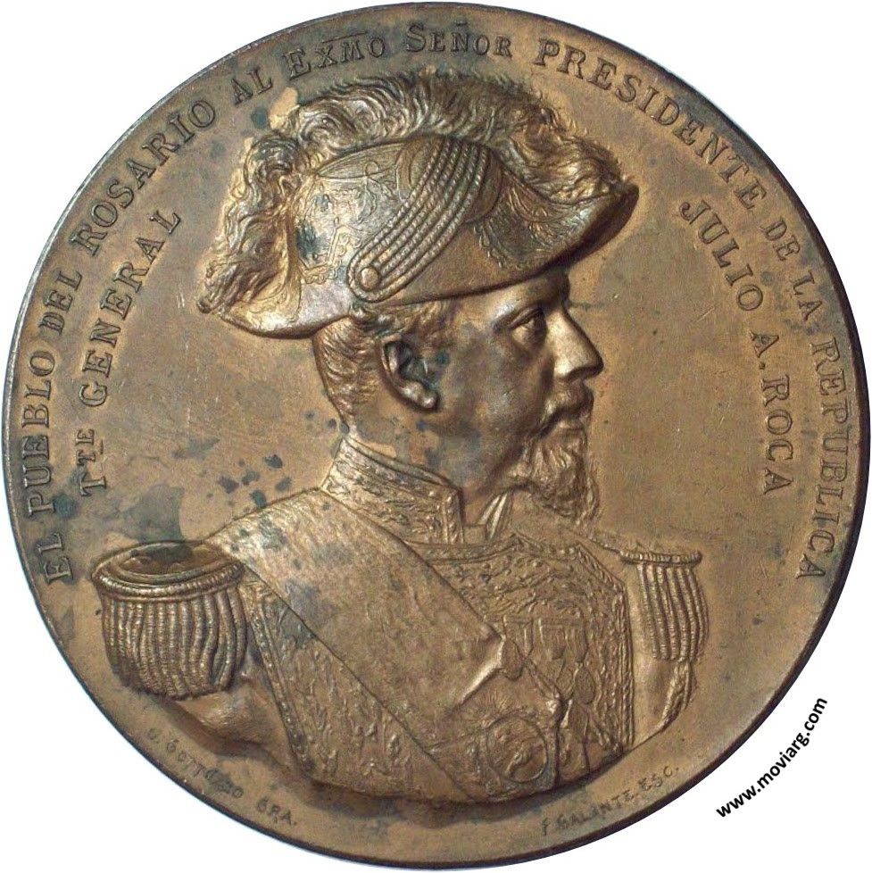 Anverso: EL PUEBLO DEL ROSARIO AL EXMO. SEÑOR PRESIDENTE DE LA REPUBLICA / TTE. GENERAL / JULIO A. ROCA. Firma: J. GOTTUZZO GRA. / F. GALANTE ESC. Reverso: LA OBRA DEL PUERTO / RECORDARÁ / VUESTRO NOMBRE Y ATESTICUARÁ / VUESTRA PREVISION PATRIOTICA / 26 OCTUBRE 1902. Firma: J. GOTTUZZO / GRA. / LAVARELLO / ESC. Referencia: | |