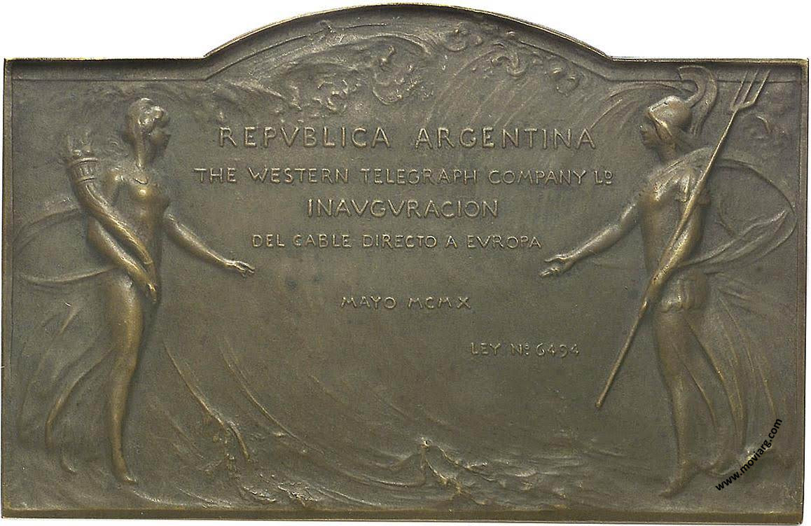 National Maritime Museum, Greenwich, London Anverso: Firma: PARIS / STERN GRAVEURReverso: REPUBLICA ARGENTINA / THE WESTERN TELEGRAPH COMPANY LD. / INAUGURACION / DEL CABLE DIRECTO A EUROPA / MAYO MCMX / LEY N°6494 Referencia: | |