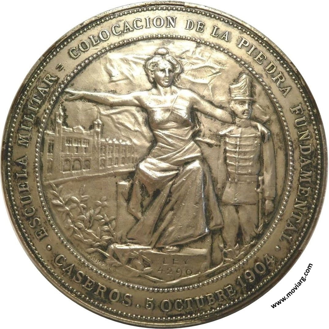 Anverso: ESCUELA MILITAR = COLOCACION DE LA PIEDRA FUNDAMENTAL / CASEROS 5 OCTUBRE 1904. Campo: LEY / 4290. Firma: A. DRESCO Reverso: REPÚBLICA ARGENTINA / PRESIDENTE / TTE. GRAL. JULIO A. ROCA / MINISTRO DE GUERRA / GENERAL DE BRIGADA / PABLO RICCHERI. Firma: J. GOTTUZZO Referencia: | |