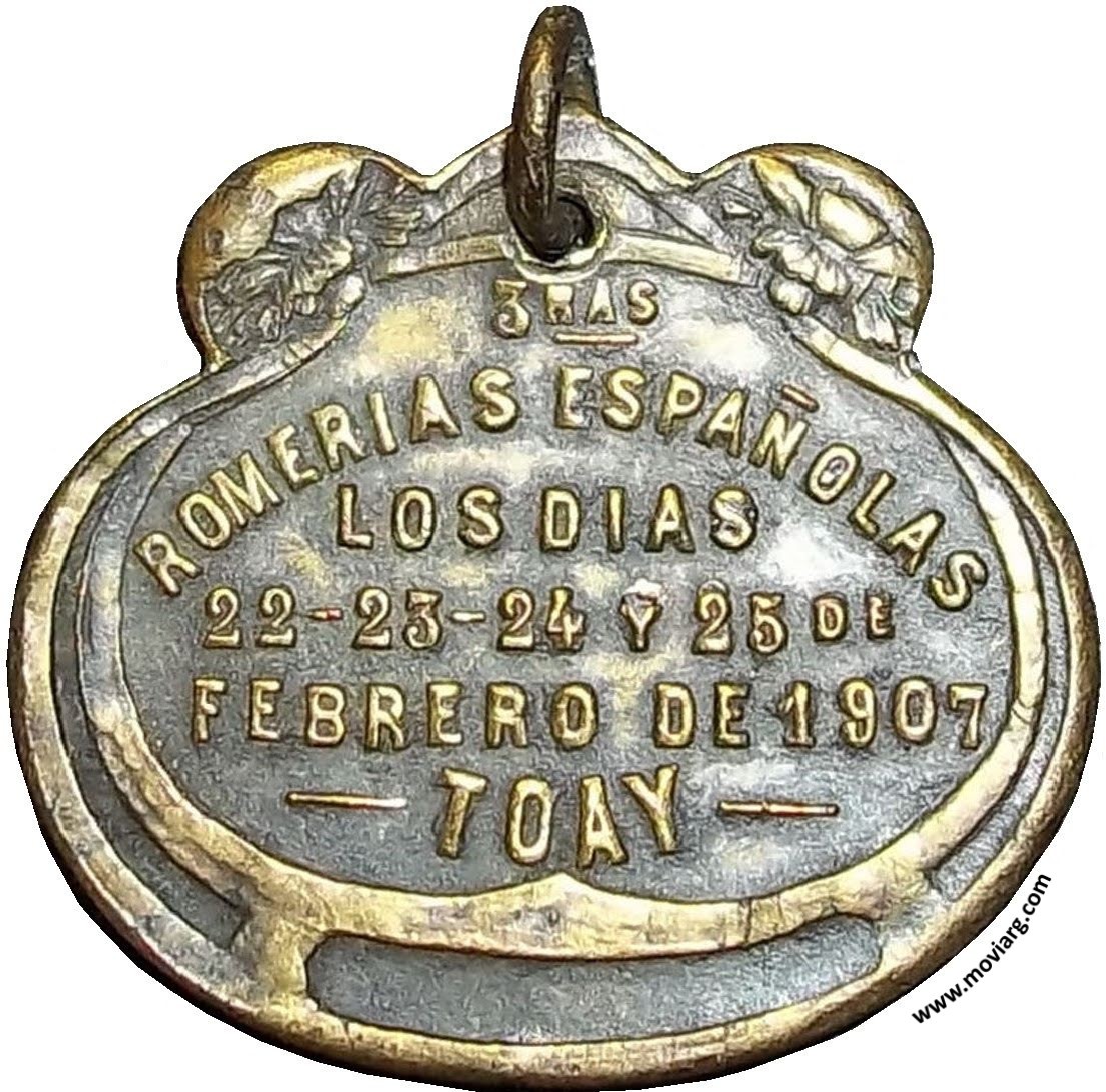 | Año: 1907 Romerías Metal: Bronce - Peso: 10.3gr - Módulo: 28x30mm - Rotación: 12hrs Grabador: Horta y Cia | |