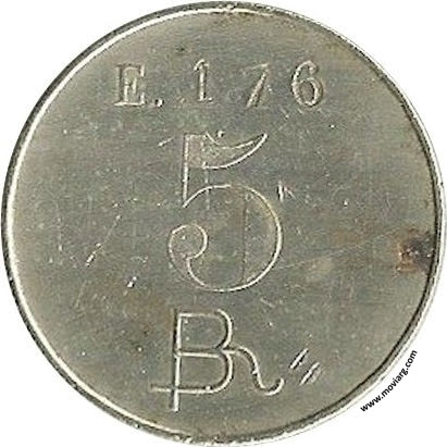 Anverso: E. [ 176 ] / 5 / B Reverso: OBRAJE "SAN JUAN" / DE / L. B. / VALE POR CINCO PESOS CONTRA / MERCADERIAS / DESVIO KILOM. 141 Canto: Estriado Recto Referencia: | |