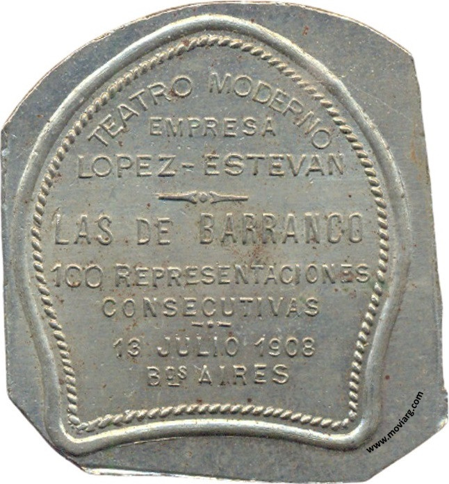 Anverso: HOMENAJE Á / G. DE LAFERRERE Reverso: TEATRO MODERNO / EMPRESA / LOPEZ - ESTEVAN / LAS DE BARRANCO / 100 REPRESENTACIONES / CONSECUTIVAS / 13 JULIO 1908 / BOS. AIRES Referencia: | |