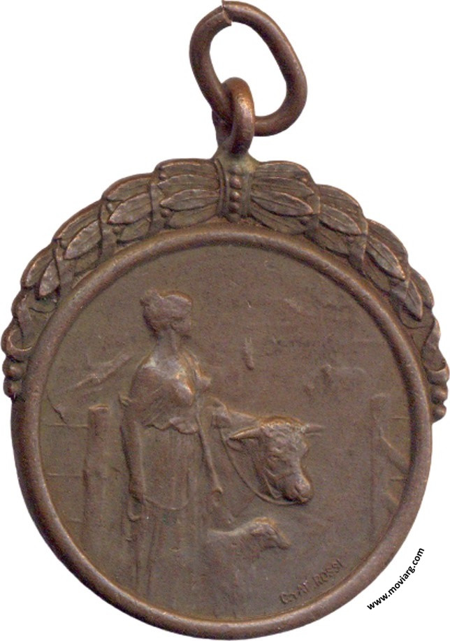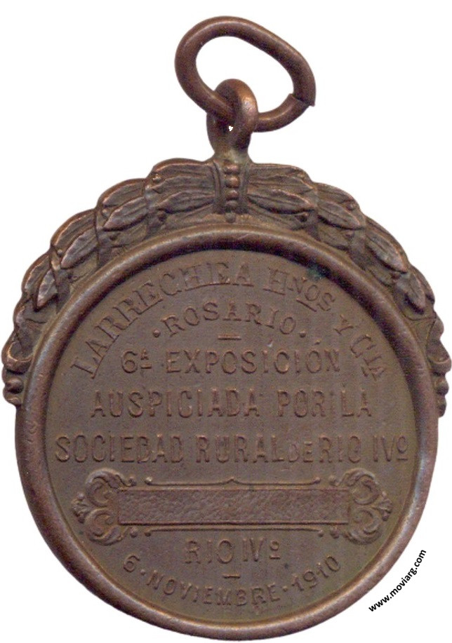 Anverso: Firma: C. Y AF. ROSSI Reverso: LARRECHEA HNOS. Y CIA. / ROSARIO / 6A. EXPOSICIÓN / AUSPICIADA POR LA / SOCIEDAD RURAL DE RIO IV° / RIO IV° / 6 NOVIEMBRE 1910 Referencia: | |