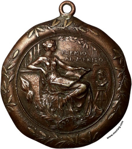 | Año: S/F Premio al Mérito y Aplicación Metal: Cobre - Peso: 17.07gr - Módulo: 35.6mm - Espesor: 2.31mm - Rotación: 12hrs Grabador: José F. Piana | |