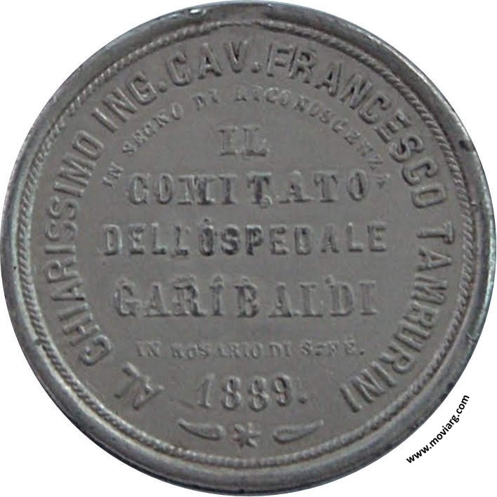 Anverso: Firma: S. CACCIA Reverso: AL CHIARISSIMO ING. CAV. FRANCESCO TAMBURINI / IN SEGNO DI RICONOSCENZA / IL / COMITATO / DELL OSPEDALE / GARIBALDI / IN ROSARIO DI S. FÉ / 1889 Referencia: | |