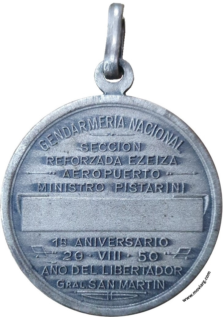 Anverso: GENERAL D. JOSE DE SAN MARTIN Reverso: GENDARMERIA NACIONAL / SECCION / REFORZADA EZEIZA / AEROPUERTO / MINISTRO PISTARINI / 1R. ANIVERSARIO / 20 · VIII · 50 / AÑO DEL LIBERTADOR / GRAL. SAN MARTIN Referencia: | |
