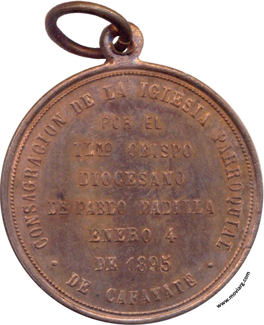 Anverso: NTRA. SRA. DEL ROSARIO ROGAD POR NOSOTROS Reverso: CONSAGRACION DE LA IGLESIA PARROQUIAL / DE CAFAYATE / POR EL / ILMO. OBISPO / DIOCESANO / DR. PABLO PADILLA / ENERO 4 / DE 1895 Referencia: | |