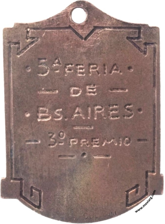 Anverso: CARNAVAL / [ 1938 ]. Campo: C. / B. Reverso: [ 5A. FERIA ] / [ DE ] / [ BS. AIRES ] / [ 3° PREMIO ]. Exergo: [ CBELLUNI (?) ] Referencia: | |