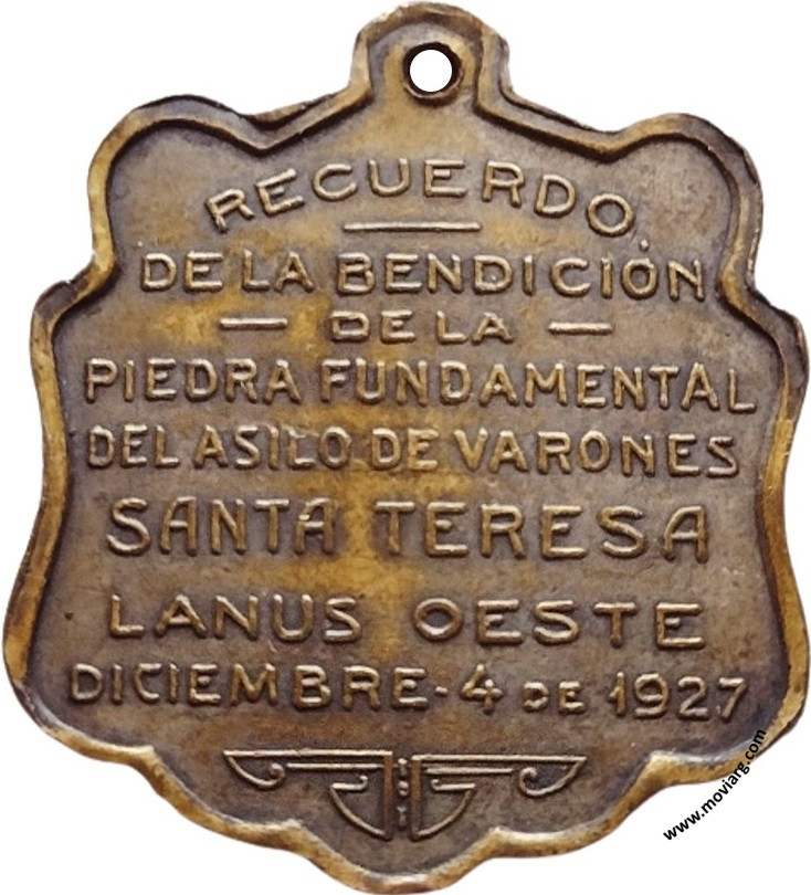 Anverso: Firma: HORTA Y CIA. Reverso: RECUERDO / DE LA BENDICIÓN / DE LA / PIEDRA FUNDAMENTAL / DEL ASILO DE VARONES / SANTA TERESA / LANUS OESTE / DICIEMBRE - 4 DE 1927 Referencia: | |