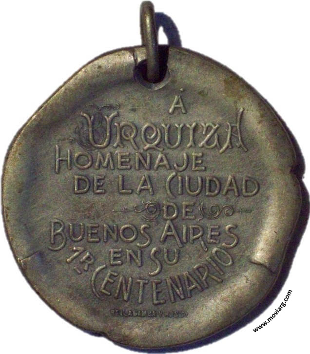 Anverso: 18 / OCTUBRE / 1801 / 1901 Reverso: Á / URQUIZA / HOMENAJE / DE LA CIUDAD / DE / BUENOS AIRES / EN SU / 1R. CENTENARIO. Firma: BELLAGAMBA Y ROSSI Referencia: | |