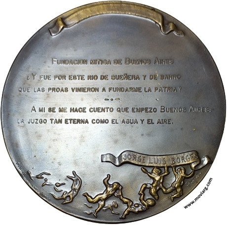 Anverso: A BUENOS AIRES. Firma: PUJIA / A.N.A. Reverso: FUNDACION MITICA DE BUENOS AIRES / ¿Y FUE POR ESTE RIO DE SUEÑERA Y DE BARRO / QUE LAS PROAS VINIERON A FUNDARME LA PATRIA? / A MI SE ME HACE CUENTO QUE EMPEZO BUENOS AIRES / LA JUZGO TAN ETERNA COMO EL AGUA Y EL AIRE / JORGE LUIS BORGES. Firma: PIANA BUENOS AIRES / PUJIA Canto: Liso. 126 / 300 Referencia: | |