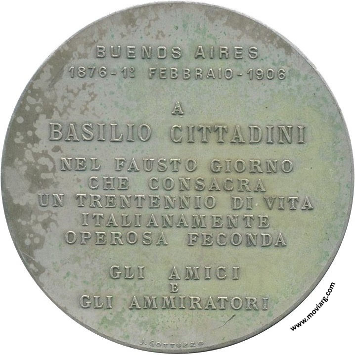 rosfil1 Anverso: Firma: F. GALANTEReverso: BUENOS AIRES / 1876 - 1º FEBBRAIO - 1906 / A / BASILIO CITTADINI / NEL FAUSTO GIORNO / CHE CONSACRA / UN TRENTENNIO DI VITA / ITALIANAMENTE / OPEROSA FECONDA / GLI AMICI / E / GLI AMMIRATORI. Firma: J. GOTTUZZO Referencia: | |