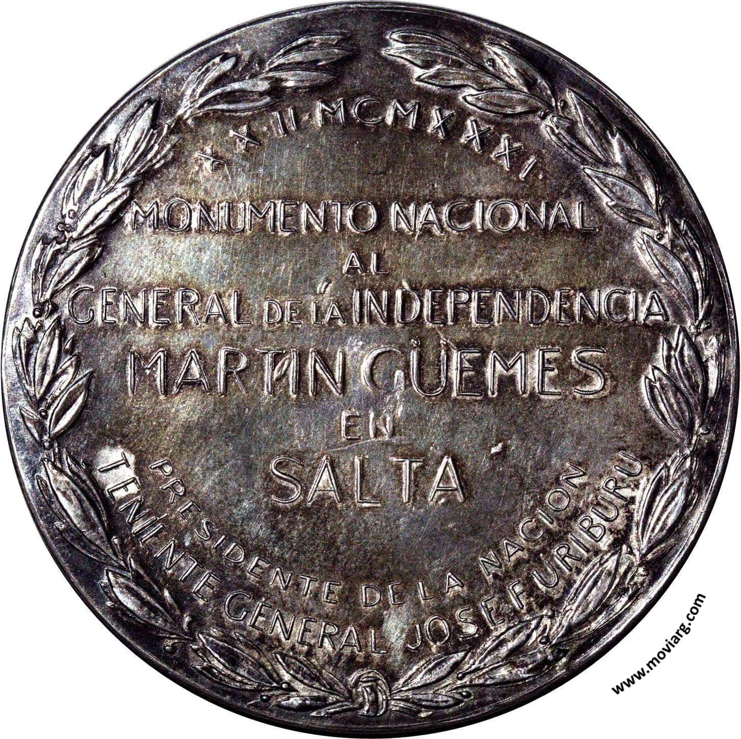 Anverso: Reverso: XX · II · MCMXXXI / MONUMENTO NACIONAL / AL / GENERAL DE LA INDEPENDENCIA / MARTIN GÜEMES / EN / SALTA / PRESIDENTE DE LA NACION / TENIENTE GENERAL JOSE F. URIBURU Referencia: | |