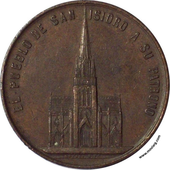 Anverso: EL PUEBLO DE SAN ISIDRO A SU PATRONO. Firma: ORZALI B. Y C. Reverso: COLOCACION DE LA PIEDRA FUNDAMENTAL DEL NUEVO TEMPLO / PADRINOS : / S.E. EL GOBERNADOR / DE LA PROVINCIA / DR. GUILLERMO UDAONDO / SRA. MES. A. DE ANCHORENA / SETIEMBRE 29 DE 1895 Referencia: | |