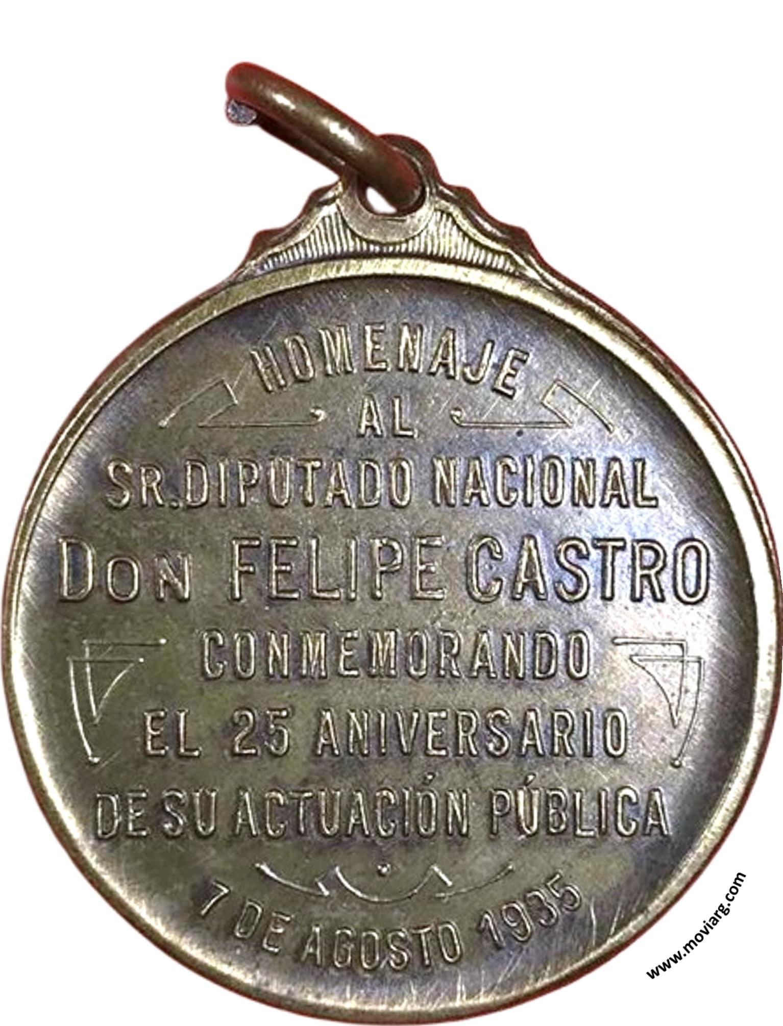 Anverso: Firma: CONSTANTE ROSSI Reverso: HOMENAJE / AL / SR. DIPUTADO NACIONAL / DON FELIPE CASTRO / CONMEMORANDO / EL 25 ANIVERSARIO / DE SU ACTUACIÓN PÚBLICA / 7 DE AGOSTO 1935 Referencia: | |