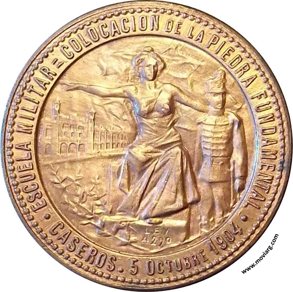 Anverso: ESCUELA MILITAR = COLOCACION DE LA PIEDRA FUNDAMENTAL / CASEROS 5 OCTUBRE 1904. Campo: LEY / 4290. Firma: A. DRESCO Reverso: REPÚBLICA ARGENTINA / PRESIDENTE / TTE. GRAL. JULIO A. ROCA / MINISTRO DE GUERRA / GENERAL DE BRIGADA / PABLO RICCHERI. Firma: J. GOTTUZZO Referencia: | |