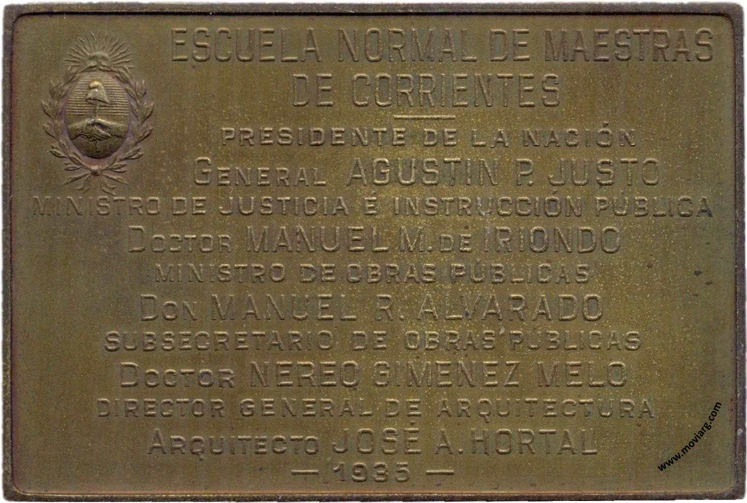 Anverso: Firma: CONSTANTE ROSSI Reverso: ESCUELA NORMAL DE MAESTRAS / DE CORRIENTES / PRESIDENTE DE LA NACIÓN / GENERAL AGUSTIN P. JUSTO / MINISTRO DE JUSTICIA É INSTRUCCIÓN PÚBLICA / DOCTOR MANUEL M. DE IRIONDO / MINISTRO DE OBRAS PÚBLICAS / DON MANUEL R. ALVARADO / SUBSECRETARIO DE OBRAS PÚBLICAS / DOCTOR NEREO GIMENEZ MELO / DIRECTOR GENERAL DE ARQUITECTURA / ARQUITECTO JOSÉ A. HORTAL / 1935 Referencia: | |