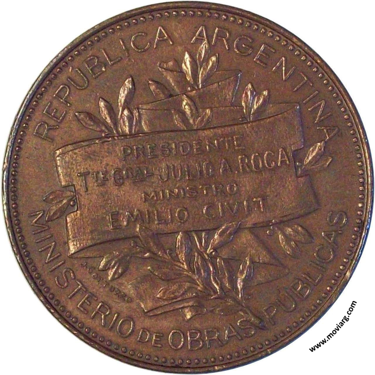 | Año: 1904 Obras y Servicios Públicos Metal: Cobre - Peso: 38.6gr - Módulo: 45mm - Espesor: 3mm Grabador: Juan Gottuzzo | |