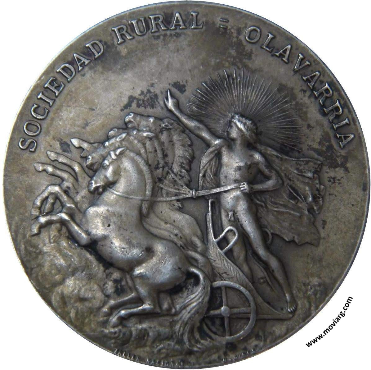 Anverso: SOCIEDAD RURAL = OLAVARRIA. Firma: TALLER NACIONAL / B. AIRES Reverso: XXVA. EXPOSICION FERIA / 4 , 5 Y 6 DE OCTUBRE 1908. Campo: LACLAU HERMANOS Canto: Liso. PLATA Referencia: | |