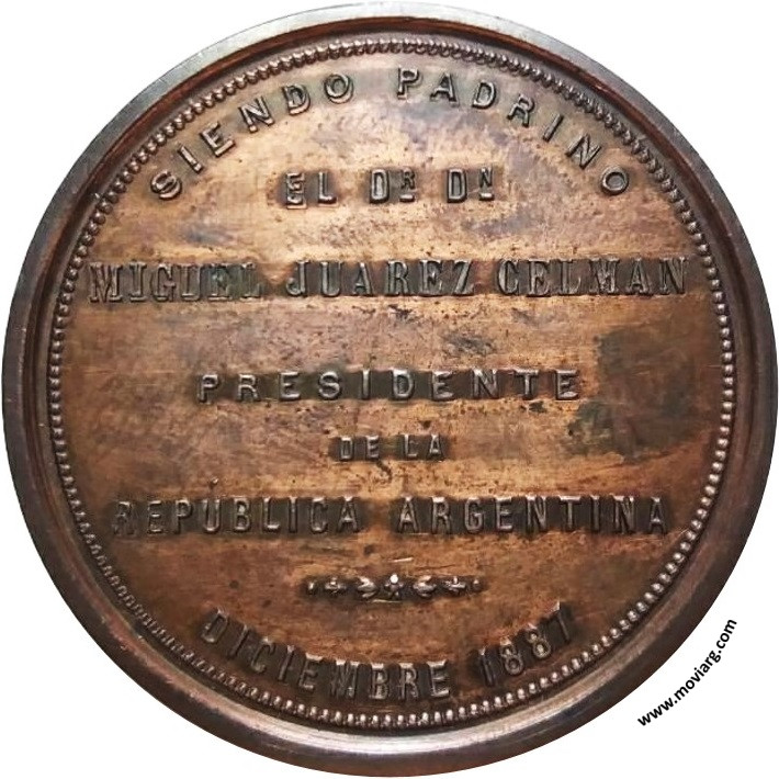 Anverso: COLOCACION DE LA PIEDRA FUNDAMENTAL / DE LA IGLESIA DE LA COLONIA CASEROS / FUNDADA POR LA SRA. VIUDA / DEL GENERAL URQUIZA Reverso: SIENDO PADRINO / EL DR. DN. / MIGUEL JUAREZ CELMAN / PRESIDENTE / DE LA / REPÚBLICA ARGENTINA / DICIEMBRE 1887 Referencia: | |