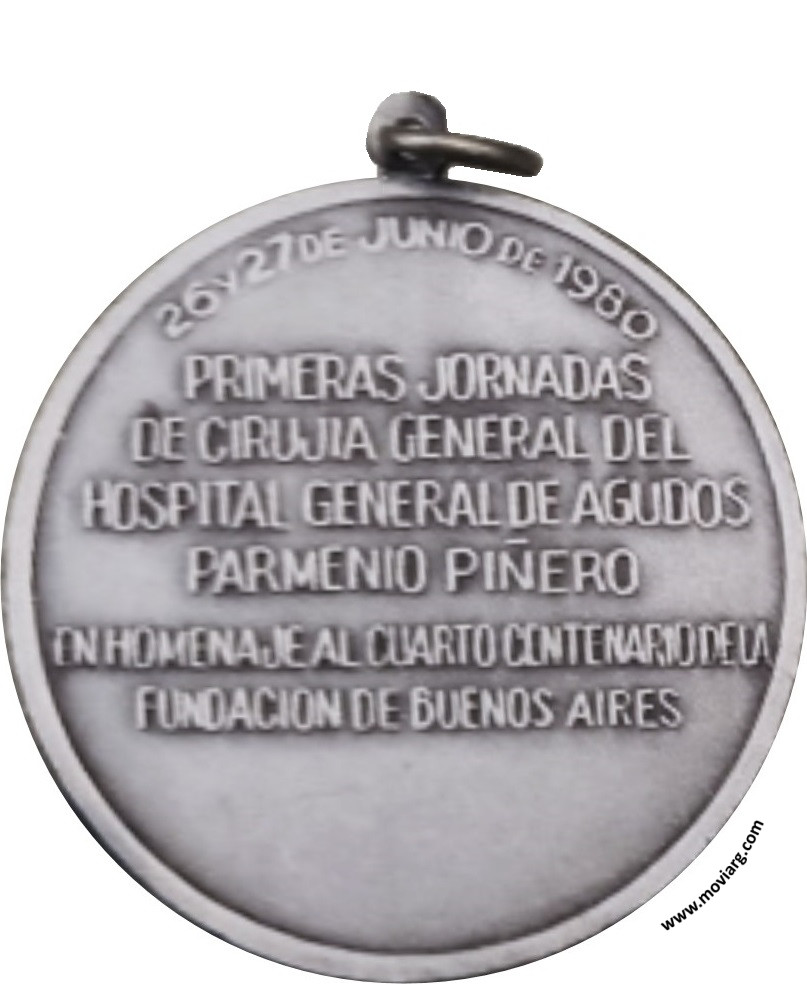 Anverso: HOSPITAL PARMENIO PIÑERO Reverso: 26 Y 27 DE JUNIO DE 1980 / PRIMERAS JORNADAS / DE CIRUJIA GENERAL DEL / HOSPITAL GENERAL DE AGUDOS / PARMENIO PIÑERO / EN HOMENAJE AL CUARTO CENTENARIO DE LA / FUNDACION DE BUENOS AIRES Referencia: | |