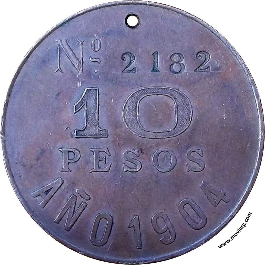 Anverso: N° [ 2182 ] / 10 / PESOS / AÑO 1904 Reverso: PATENTE DE AMBULANTE Referencia: BURZIO-308 | |