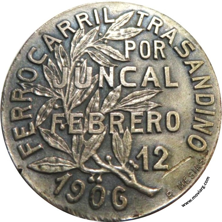Anverso: CHILE · ARGENTINA Reverso: FERROCARRIL TRASANDINO / POR / JUNCAL / FEBRERO / 12 / 1906. Firma: R. MESIAS Canto: Liso. PLATA Referencia: | |