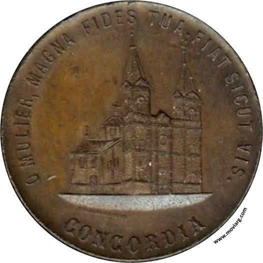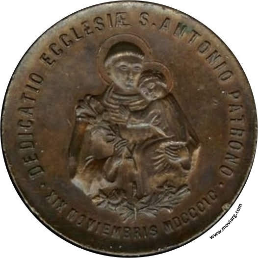 Anverso: DEDICATION ECCLESIÆ S. ANTONIO PATRONO / XIX NOVIEMBRIS MDCCCIC Reverso: O MULIER, MAGNA FIDES TUA. FIAT SICUT VIS. / CONCORDIA. Firma: BELLAGAMBA Y ROSSI Referencia: | |
