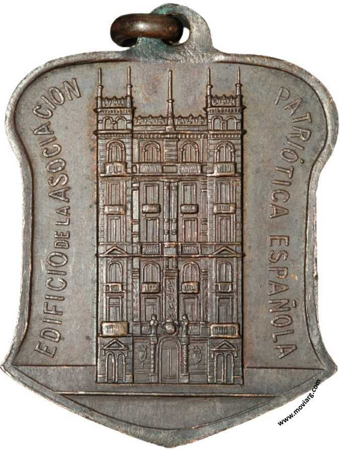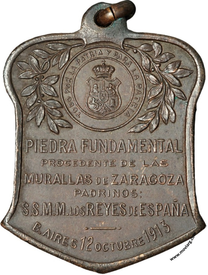 Anverso: EDIFICIO DE LA ASOCIACION / PATRIÓTICA ESPAÑOLA Reverso: PIEDRA FUNDAMENTAL / PROCEDENTE DE LAS / MURALLAS DE ZARAGOZA / PADRINOS: / S.S.M.M. LOS REYES DE ESPAÑA / B. AIRES 12 OCTUBRE 1913. Campo: TODO POR LA PATRIA Y PARA LA PATRIA Referencia: | |