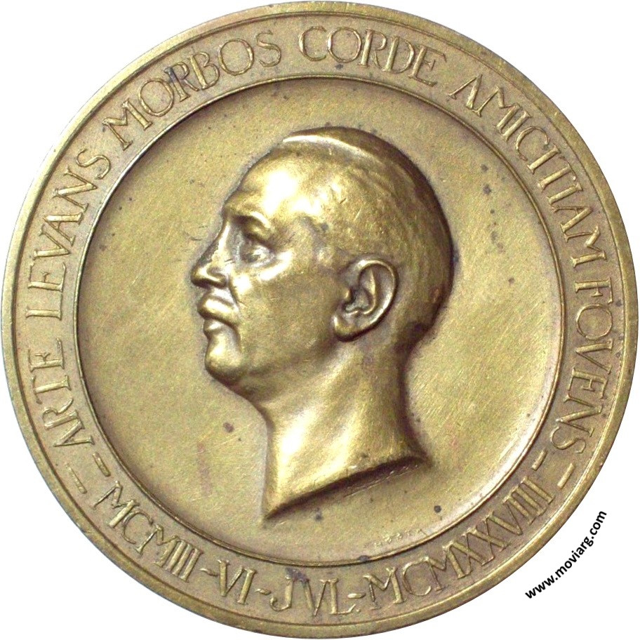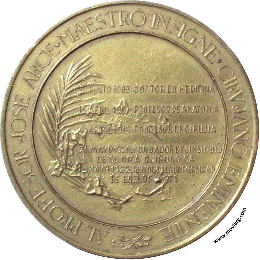 Anverso: ARTE LEVANS MORBOS CORDE AMICITIAM FOVENS / MCMIII - VI - JVL - MCMXXVIII. Firma: HORTA Reverso: AL PROFESOR JOSE ARCE MAESTRO INSIGNE CIRUJANO EMINENTE / 6 JULIO 1903. DOCTOR EN MEDICINA / 1° ABRIL 1907. PROFESOR DE ANATOMIA / 4 ABRIL 1919. PROFESOR DE CIRUJIA / 21 MAYO 1920. FUNDADOR DEL INSTITUTO / DE CLINICA QUIRÚRGICA / 1° MAYO 1922. RECTOR DE LA UNIVERSIDAD / DE BUENOS AIRES Referencia: | |
