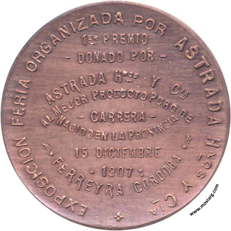 Anverso: Firma: BELLAGAMBA / Y ROSSI Reverso: EXPOSICION FERIA ORGANIZADA POR ASTRADA HNOS. Y CIA. / 1ER. PREMIO / - DONADO POR - / ASTRADA HNOS. Y CIA. / AL MEJOR PRODUCTO PURO DE / - CARRERA - / NACIDO EN LA PROVINCIA / 15 DICIEMBRE / 1907 / FERREYRA CÓRDOBA Referencia: | |