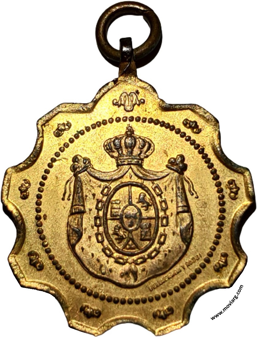 | Año: 1899 Romerías Metal: Dorado - Peso: 8.42gr - Módulo: 29.54x35.24mm - Espesor: 1.96mm - Rotación: 12hrs Grabador: José Bellagamba y Constante Rossi | |