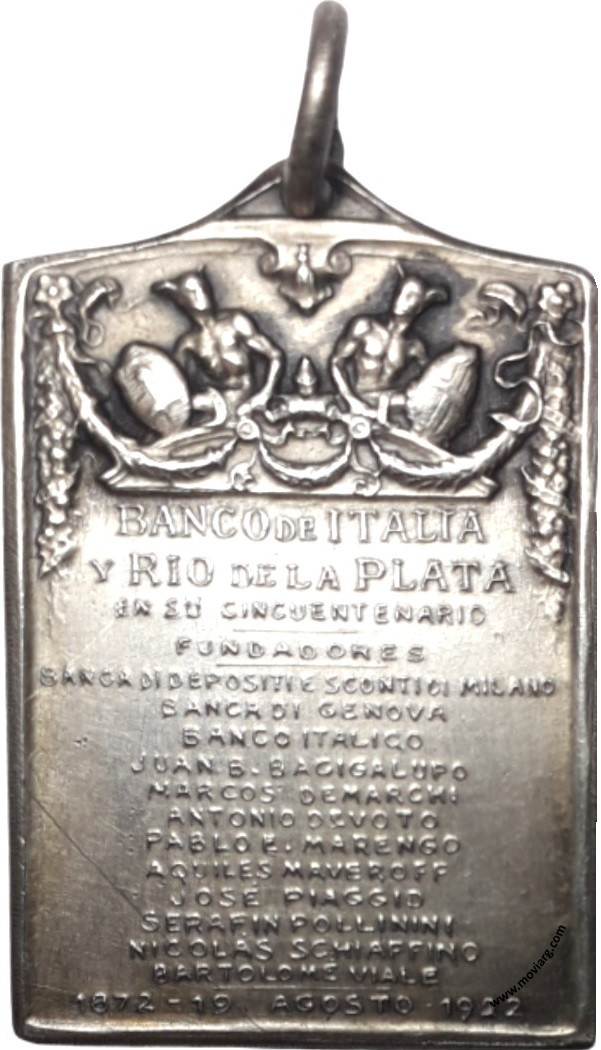 Colección MDS Anverso: Firma: GOTTUZZO Y PIANAReverso: BANCO DE ITALIA / Y RIO DE LA PLATA / EN SU CINCUENTENARIO / FUNDADORES / BANCA DI DEPOSITIE SCONTI DI MILANO / BANCA DI GENOVA / BANCO ITALICO / JUAN B. BACIGALUPO / MARCOS DEMARCHI / ANTONIO DEVOTO / PABLO E. MARENGO / AQUILES MAVEROFF / JOSÉ PIAGGIO / SERAFIN POLLININI / NICOLÁS SCHIAFFINO / BARTOLOMÉ VIALE / 1872 - 19 AGOSTO - 1922 Referencia: | |
