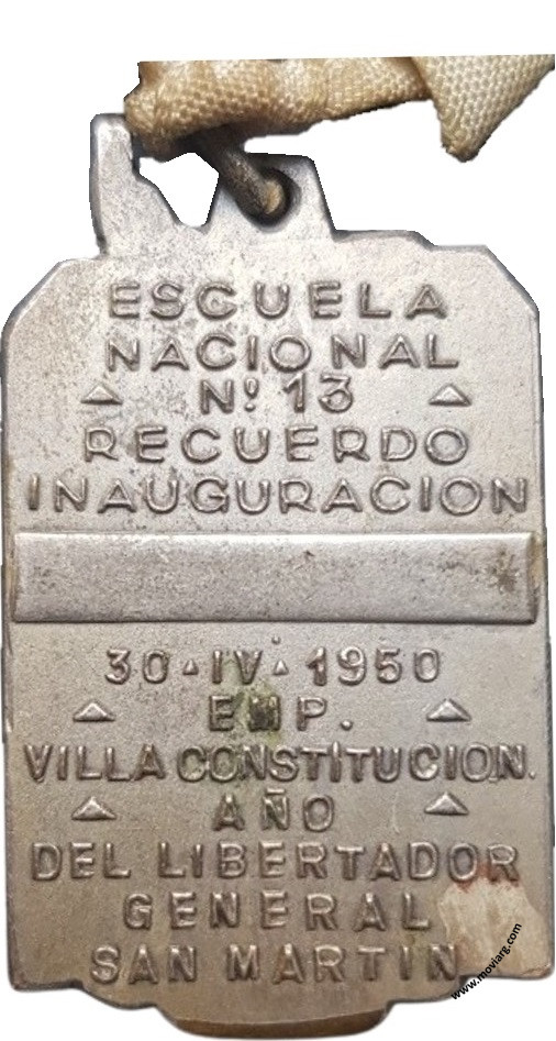 Anverso: Reverso: ESCUELA / NACIONAL / N° 13 / RECUERDO / INAUGURACION / 30 · IV · 1950 / EMP. / VILLA CONSTITUCION / AÑO / DEL LIBERTADOR / GENERAL / SAN MARTIN Referencia: | |