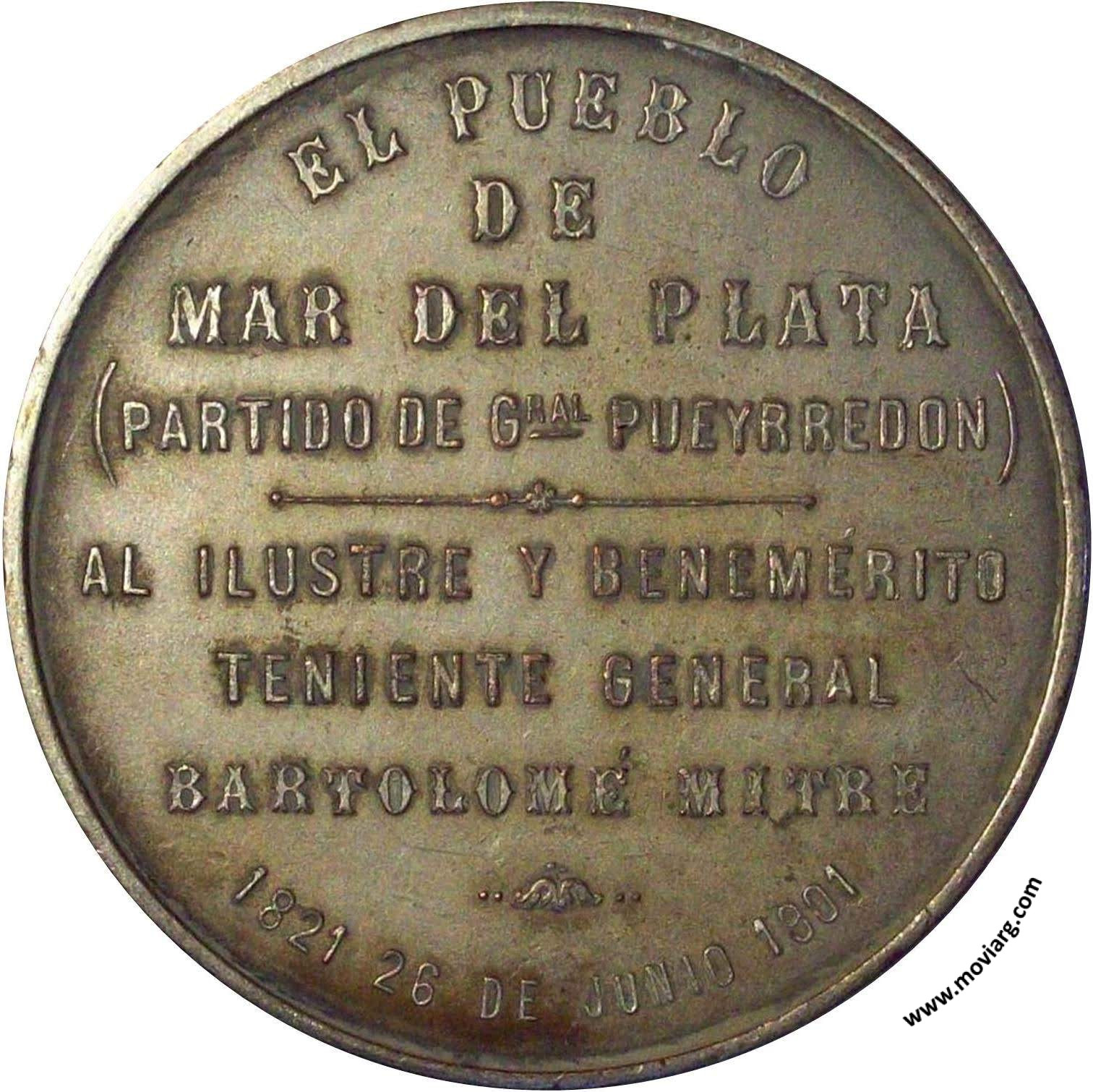 Anverso: Firma: BELLAGAMBA Y ROSSI Reverso: EL PUEBLO / DE / MAR DEL PLATA / ( PARTIDO DE GL.PUEYRREDON ) / AL ILUSTRE Y BENEMÉRITO / TENIENTE GENERAL / BARTOLOME MITRE / 1821 26 DE JUNIO 1901 Referencia: ROSA-13 (M80) | |