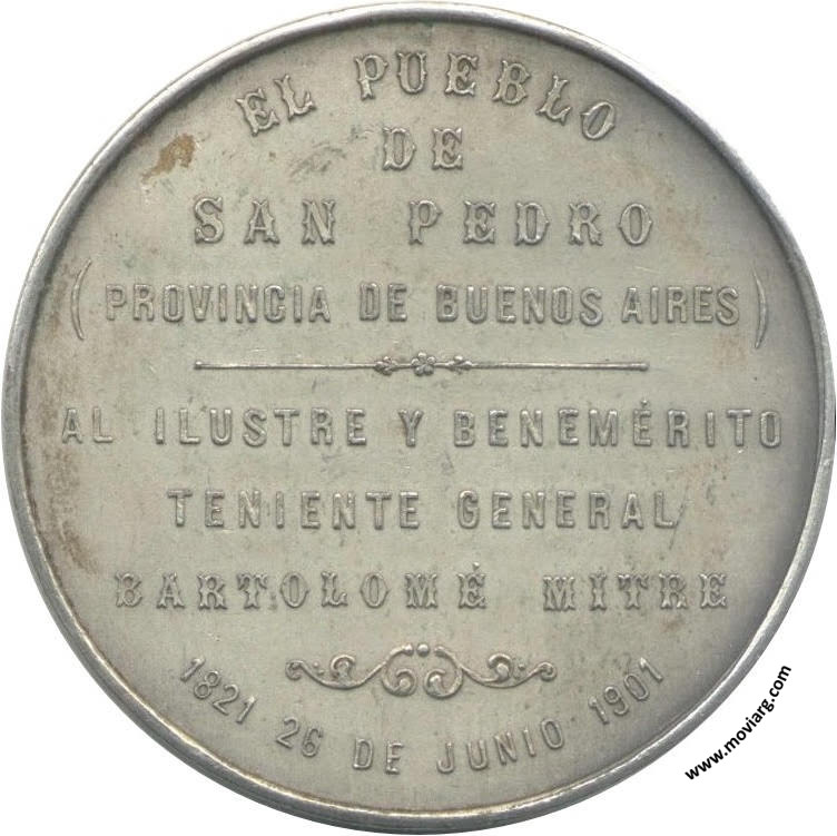 Anverso: LXXX AÑOS. Firma: BELLAGAMBA Y ROSSI Reverso: EL PUEBLO / DE / SAN PEDRO / ( PROVINCIA DE BUENOS AIRES ) / AL ILUSTRE Y BENEMÉRITO / TENIENTE GENERAL / BARTOLOMÉ MITRE / 1821 26 DE JUNIO 1901 Referencia: | |