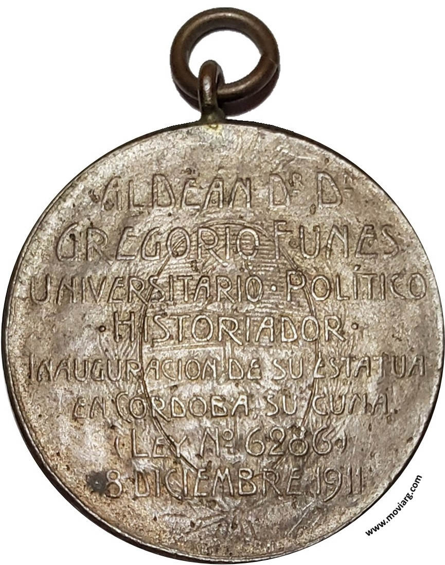 Anverso: 1749 - 1829. Firma: ESC. / L. SALA Reverso: AL DEÁN DR. DN. / GREGORIO FUNES / UNIVERSITARIO · POLÍTICO / HISTORIADOR / INAUGURACION DE SU ESTATUA / EN CORDOBA SU CUNA / ( LEY N° 6286 ) / 8 DICIEMBRE 1911. Firma: PASTORINO Y SALA BS. AIRES Referencia: | |