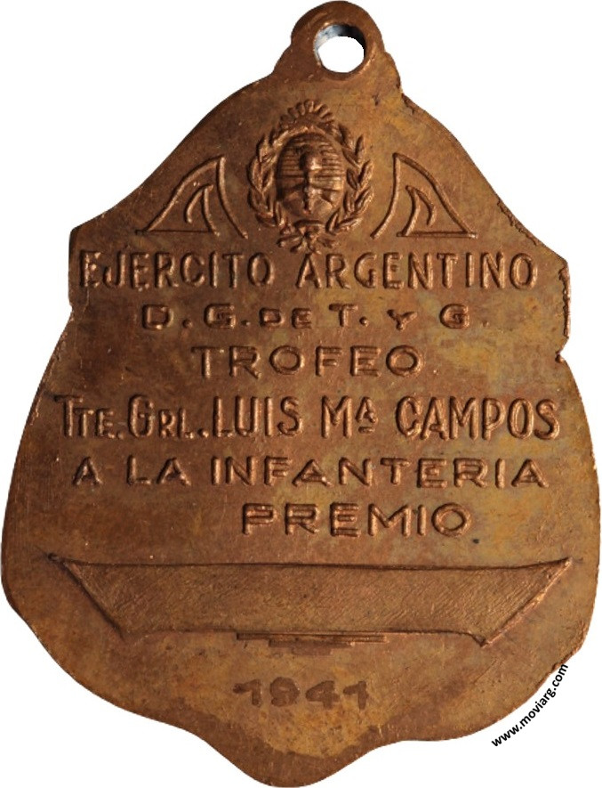 Anverso: Reverso: EJERCITO ARGENTINO / D. G. DE T. Y G. / TROFEO / TTE. GRL. LUIS MA. CAMPOS / A LA INFANTERIA / PREMIO / 1941 Referencia: | |