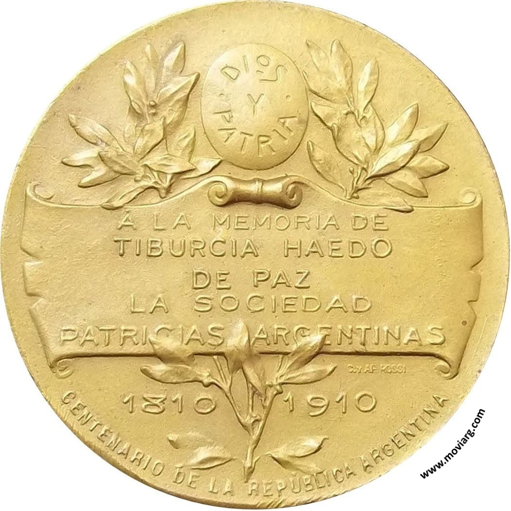 Anverso: 1767 / 1839 Reverso: DIOS / Y / PATRIA / Á LA MEMORIA DE / TIBURCIA HAEDO / DE PAZ / LA SOCIEDAD / PATRICIAS ARGENTINAS / 1810 1910 / CENTENARIO DE LA REPÚBLICA ARGENTINA. Firma: C. Y AF. ROSSI Referencia: | |