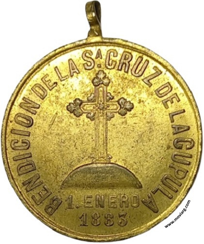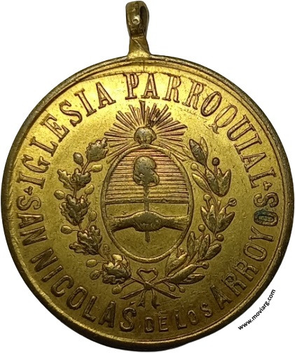 Anverso: IGLESIA PARROQUIAL / SAN NICOLÁS DE LOS ARROYOS Reverso: BENDICION DE LA SA. CRUZ DE LA CUPULA / 1. ENERO / 1883 Referencia: | |