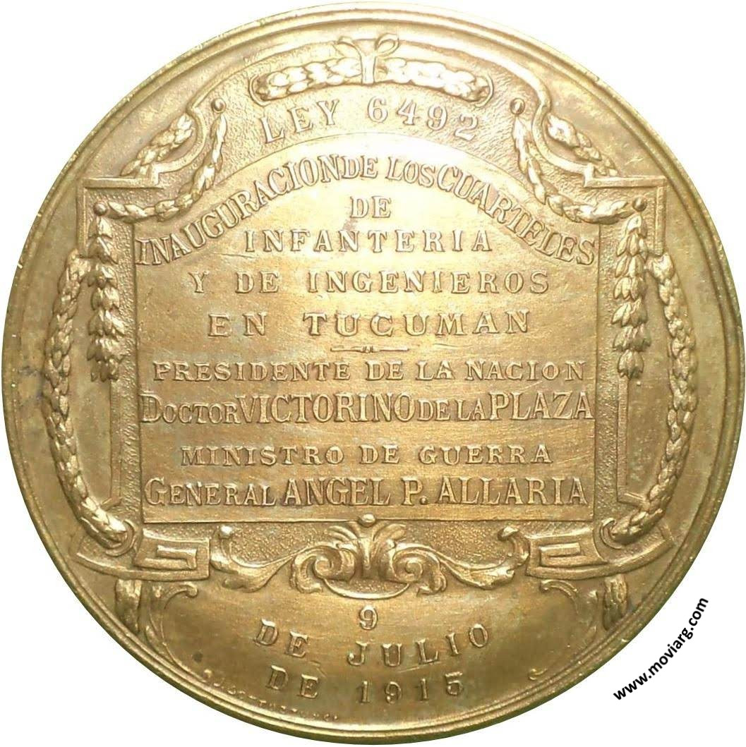 Anverso: Reverso: LEY 6492 / INAUGURACION DE LOS CUARTELES / DE INFANTERIA / Y DE INGENIEROS / EN TUCUMAN / PRESIDENTE DE LA NACION / DOCTOR VICTORINO DE LA PLAZA / MINISTRO DE GUERRA / GENERAL ANGEL P. ALLARIA / 9 / DE JULIO / DE 1915. Firma: J. GOTTUZZO Y CA. Referencia: | |