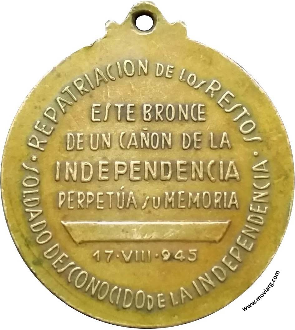 Anverso: DIO TODO A LA PATRIA / Y NADA LE PIDIO Reverso: REPATRIACION DE LOS RESTOS / SOLDADO DESCONOCIDO DE LA INDEPENDECIA / ESTE BRONCE / DE UN CAÑON DE LA / INDEPENDENCIA / PERPETÚA SU MEMORIA / 17 · VIII · 945 Referencia: | |