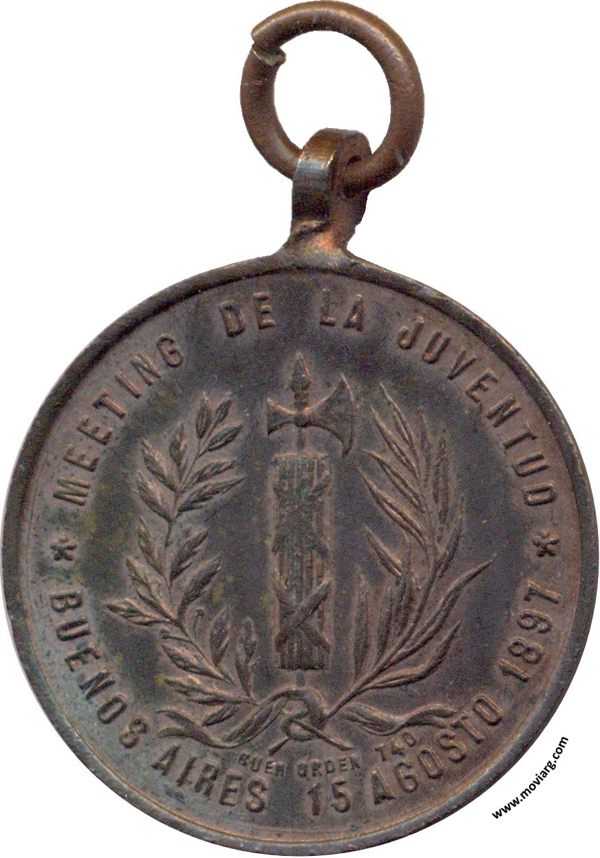 Anverso: HONRADEZ / CIVISMO / TALENTO (Bartolomé Mitre, Vicente Fidel López y Bernardo de Irigoyen) Reverso: MEETING DE LA JUVENTUD / BUENOS AIRES 15 AGOSTO 1897. Firma: BUEN ORDEN 740 Canto: Humberto Burzio: "Buenos Aires en la medalla" 1981 p36. Referencia: BURZIO-76 | |