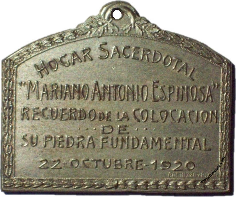 Anverso: Firma: Q. PIANA Reverso: HOGAR SACERDOTAL / " MARIANO ANTONIO ESPINOSA " / RECUERDO DE LA COLOCACION / DE / SU PIEDRA FUNDAMENTAL / 22 OCTUBRE 1920. Firma: GOTTUZZO Y PIANA Canto: Humberto Burzio: "Buenos Aires en la medalla" 1981 p1022. Referencia: BURZIO-3239 | |